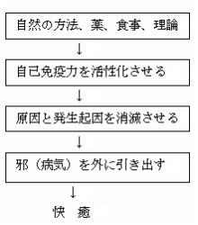 中華自然療法医学では、病気を親族のように見なし、師に対するように接します。そして病気のきっかけ、原因、病を得た下地を取り除き、病気となった条件ひとつひとつをなくしてゆきます。そうすれば病気は、薪を取られた竈のように、自然と火が消えてお湯がさめてゆくように、治療しなくても治るのです。