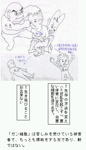 中国の古典「三字経」には、「人の初め、性はもと善なり(人はその初めにおいて、本の性質は善である)」との言葉がありますが、同様に「癌の初め、性はもと善なり」と言うことが出来ます。体外体内の両方から、多種多様な悪影響が及ぼされると、人体の細胞は二つの選択肢を迫られます。そのまま死んでしまうか、それとも自力で自分を救うかです。つまり細胞は黙って死ぬのでなければ、自ら機能を改造し、自らの属する身体全体に向かって一揆を起こし、生き延びる道を求めようとします。人間が悪しき環境のもとでは、一揆や反乱という悪しき生き方で生き延びるしかないのと同じように、細胞もガン化することにより生き延びようとするのです。しかし、多くの人はガンとなる原因やきっかけが分からず、また分かったとしても原因を解消する方法がわからないので、結局は何とか自力で生き延びようとする細胞を「ガン細胞」として断罪し、環境の改善はそっちのけで、ひたすらガン細胞を皆殺しにするばかりです。