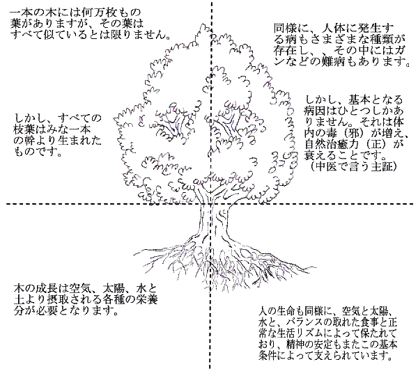 世の中のすべての出来事に因果関係があります。ガンもまた例外ではありません。仏教家は「今この世での状況が前世の因果であり、来世がどのようなものか知りたければ、今行っていることを見れば良い」と言います。同様にどのような病気の発生や予防も(もちろんガンも含みます)、自然の因果関係から決して分離したものではないと、考えられます*@。何らかの病気にせよ事件にせよ、要因だけでは発生せず、要因が何かを引き起こす契機があってはじめて結果が生じます。したがって要因となるものを無くし、契機を退けてはじめて結果を防ぐことができるのであり、これが普遍的なものごとの理と言えます。ガン予防についても、ただガン腫瘤の発生を防ぐことだけに目を向けていて良いのでしょうか?ガン細胞が存在しているかどうかを判断基準とする治療法では、それこそ「ガンは無くなったが、人もなくなった」ということになってしまうかも知れません。